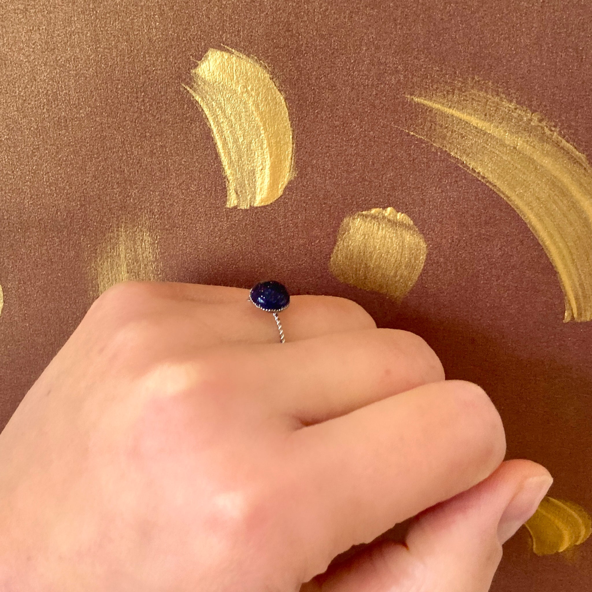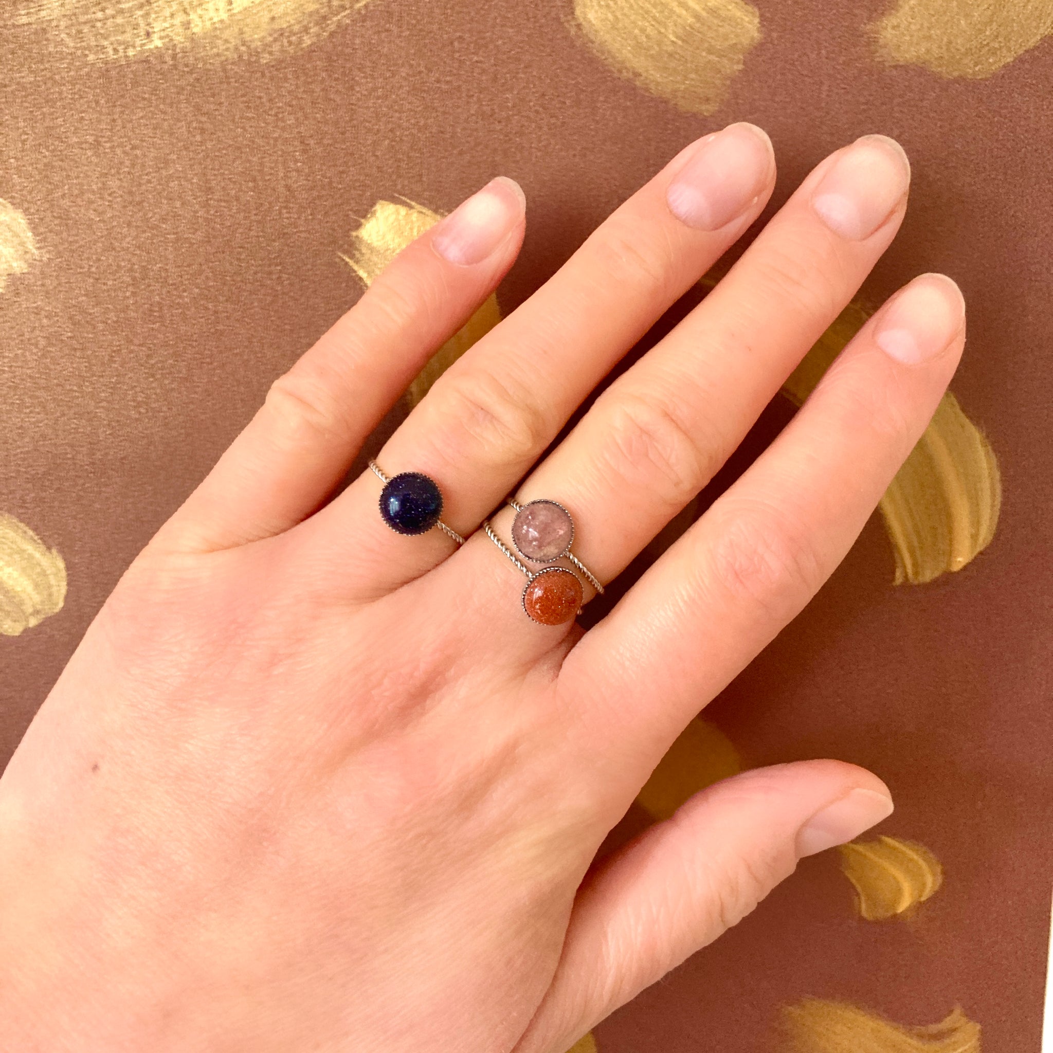 Bague réglable en acier inoxydable argenté et pierres semi-précieuses : quartz fraise (rose clair moucheté), blue sand (bleu très foncé pailleté) ou pierre de soleil (terracotta pailleté). L'anneau est torsadé.