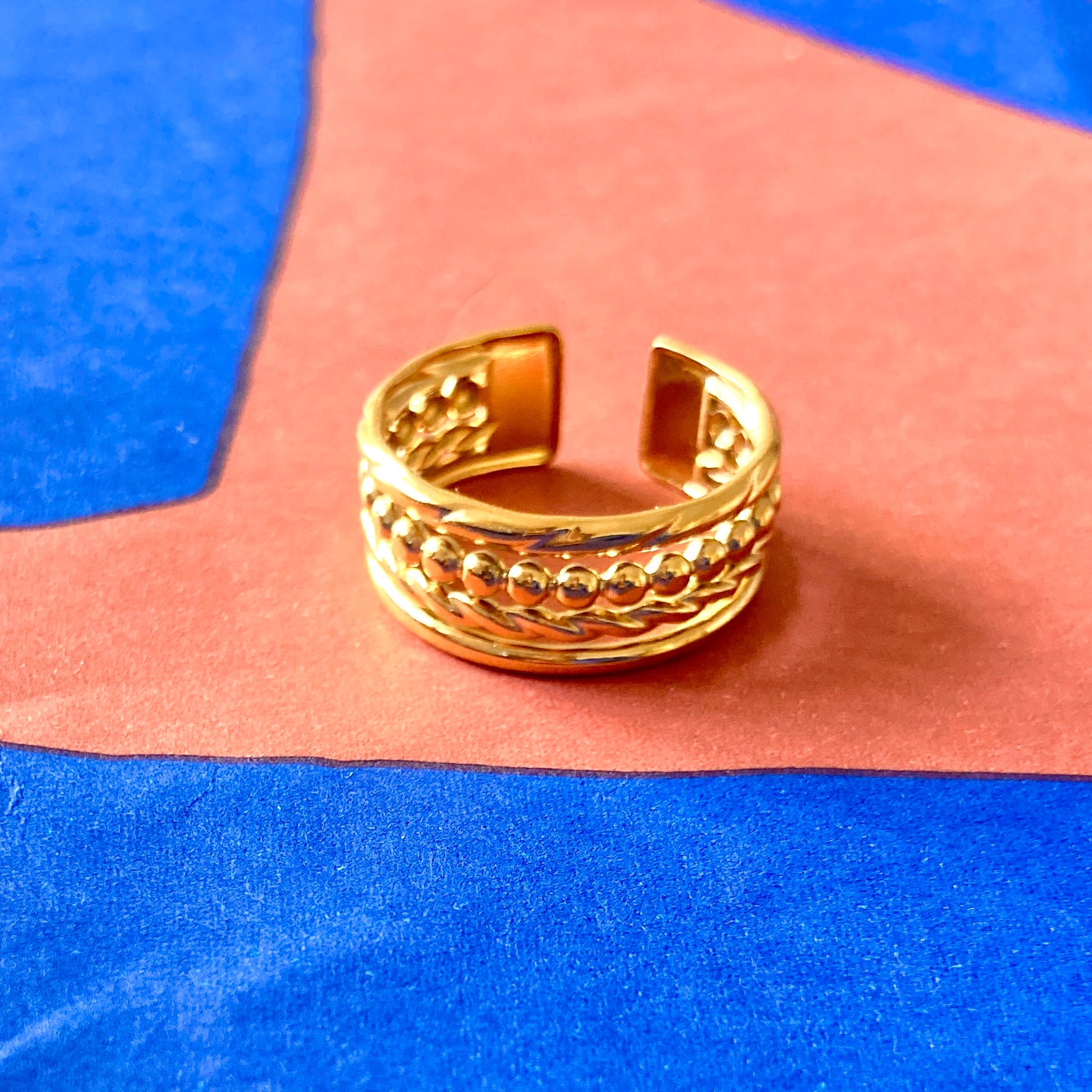 Bague large réglable (tailles 52 à 60) en acier inoxydable doré.