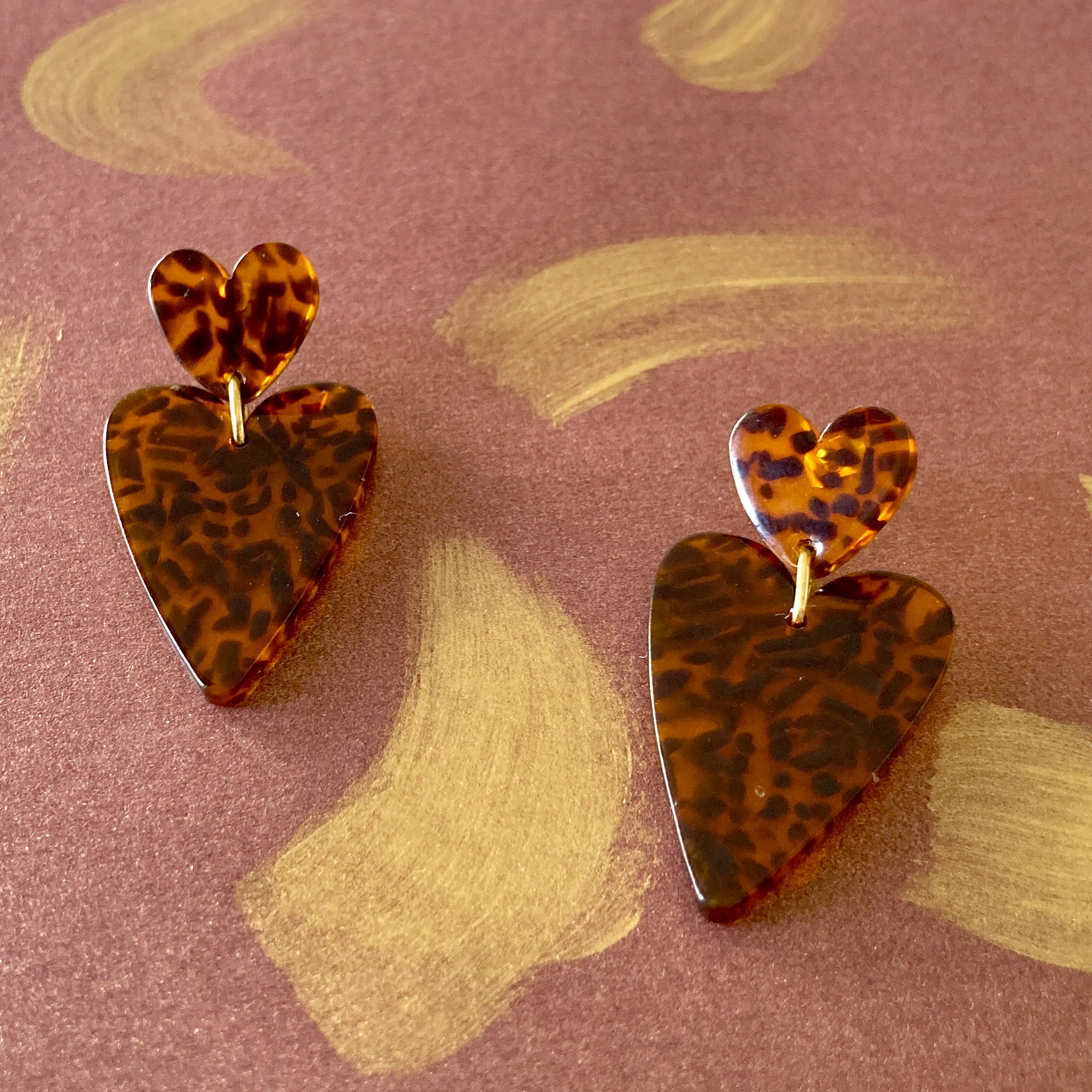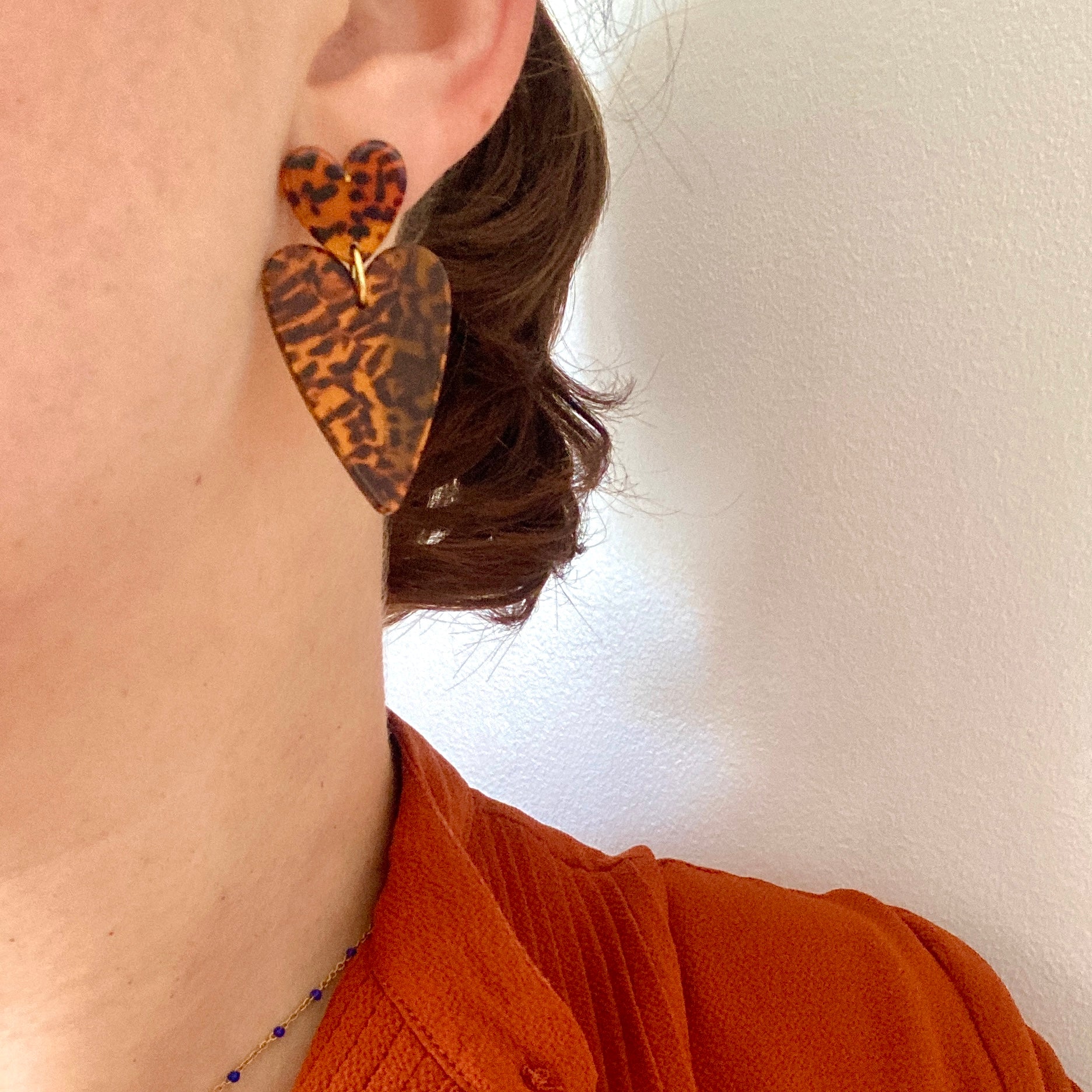 Clous d'oreilles coeurs et pendentifs coeur en résine léopard, reliés par un anneau doré. Hauteur totale des boucles : 4,5 cm environ.