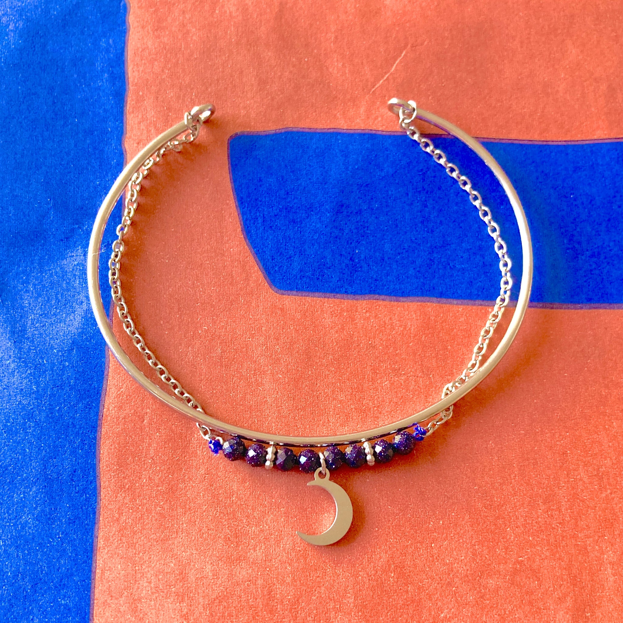 Bracelet réglable double (jonc et chaîne) en acier inoxydable argenté avec des pierres fines : blue sand (bleu très foncé pailleté).