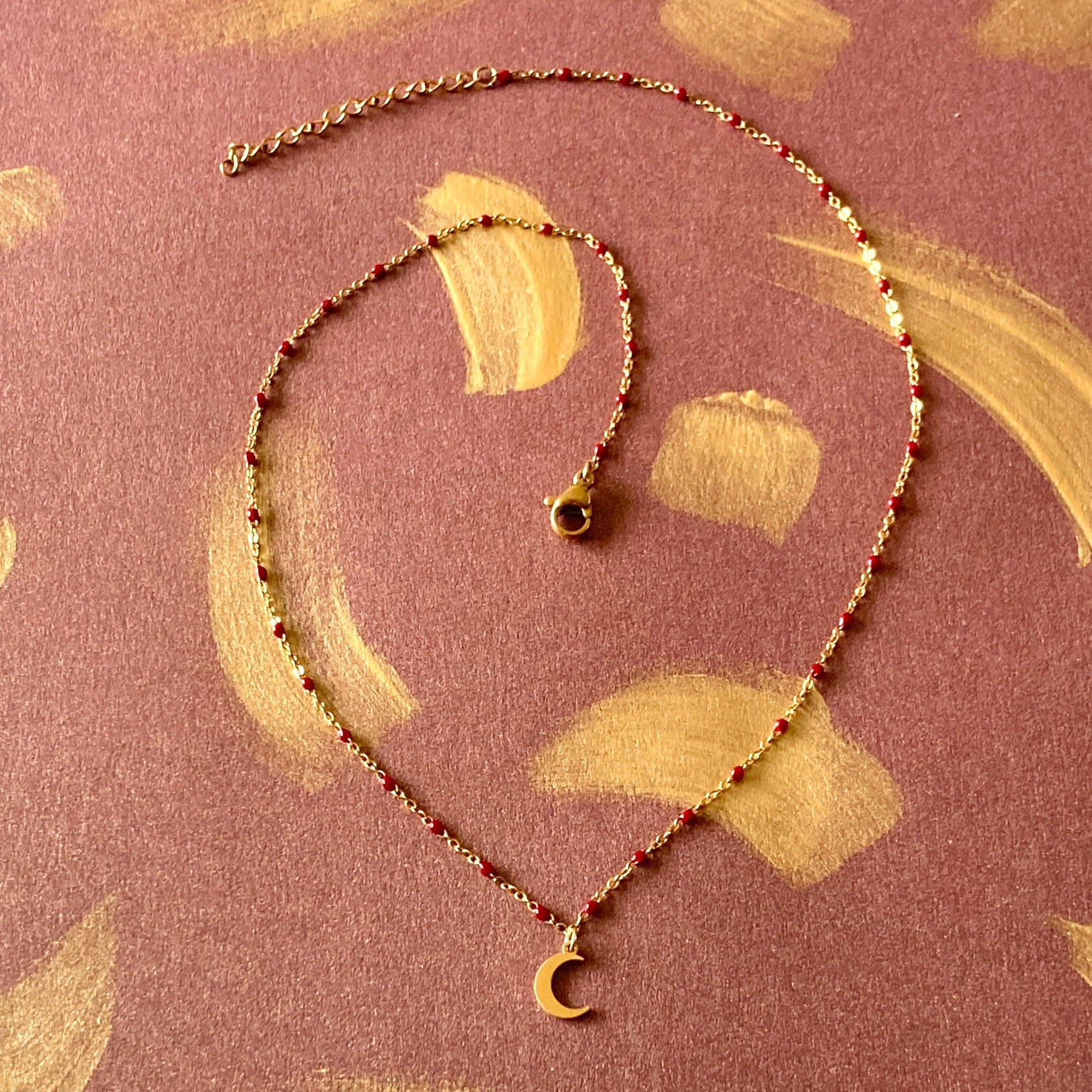 Collier en acier inoxydable doré et gouttes de résine rouge foncé, pendentif avec lune, fermoir avec chaînette pour ajuster la longueur du collier.
