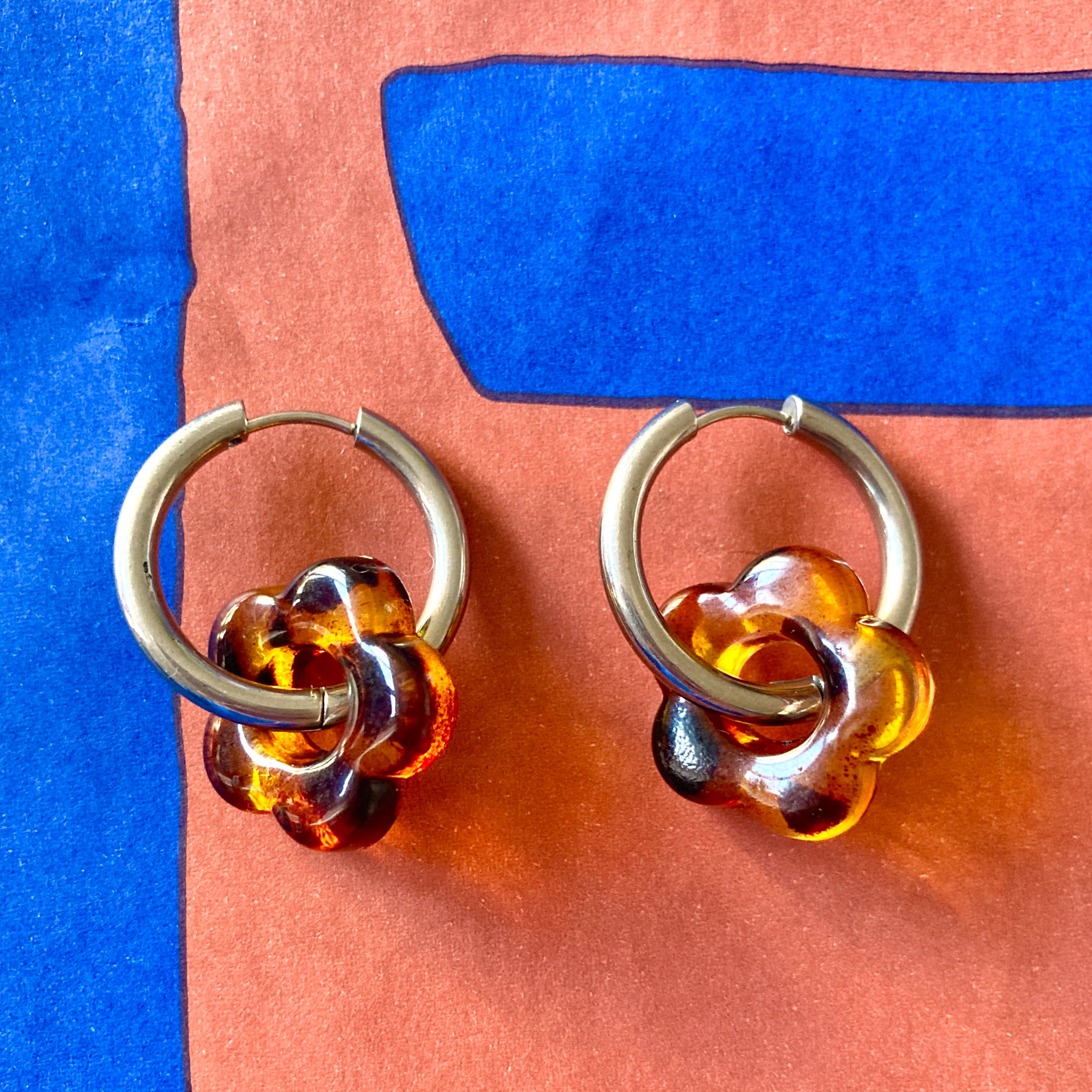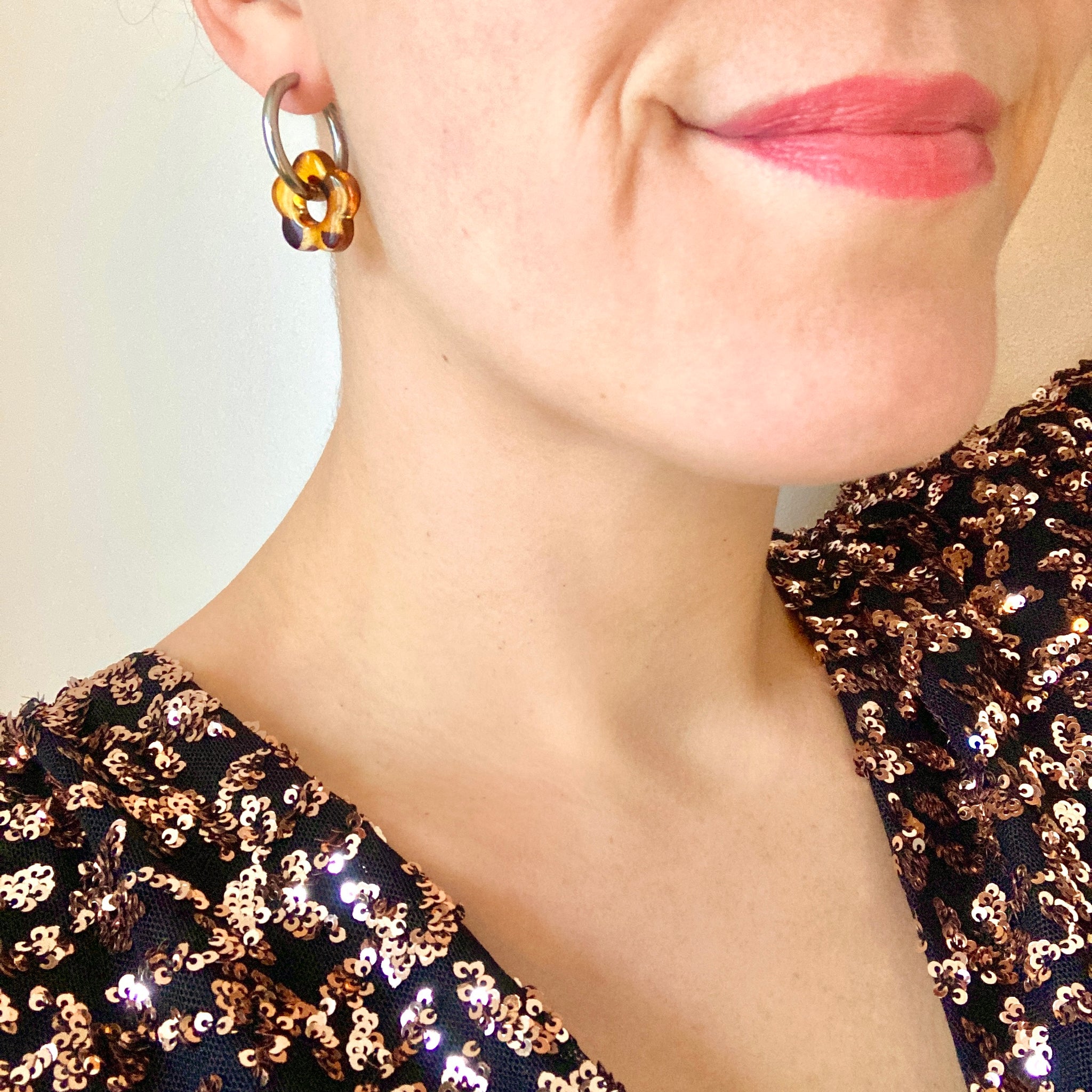 Boucles d'oreilles créoles en acier inoxydable argenté et fleurs en résine léopard. Diamètre des créoles en acier : 18 mm.