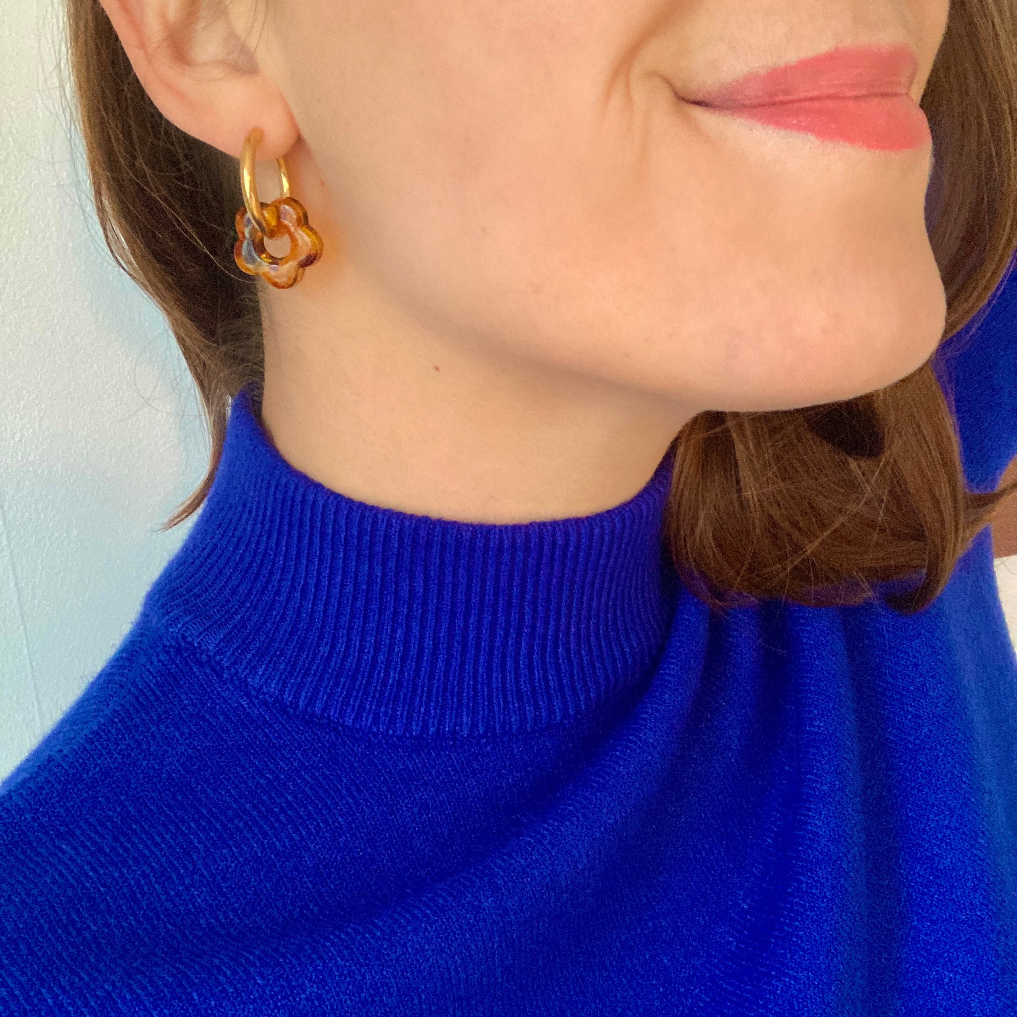 Boucles d'oreilles créoles en acier inoxydable argenté et fleurs en résine léopard. Diamètre des créoles en acier : 18 mm.