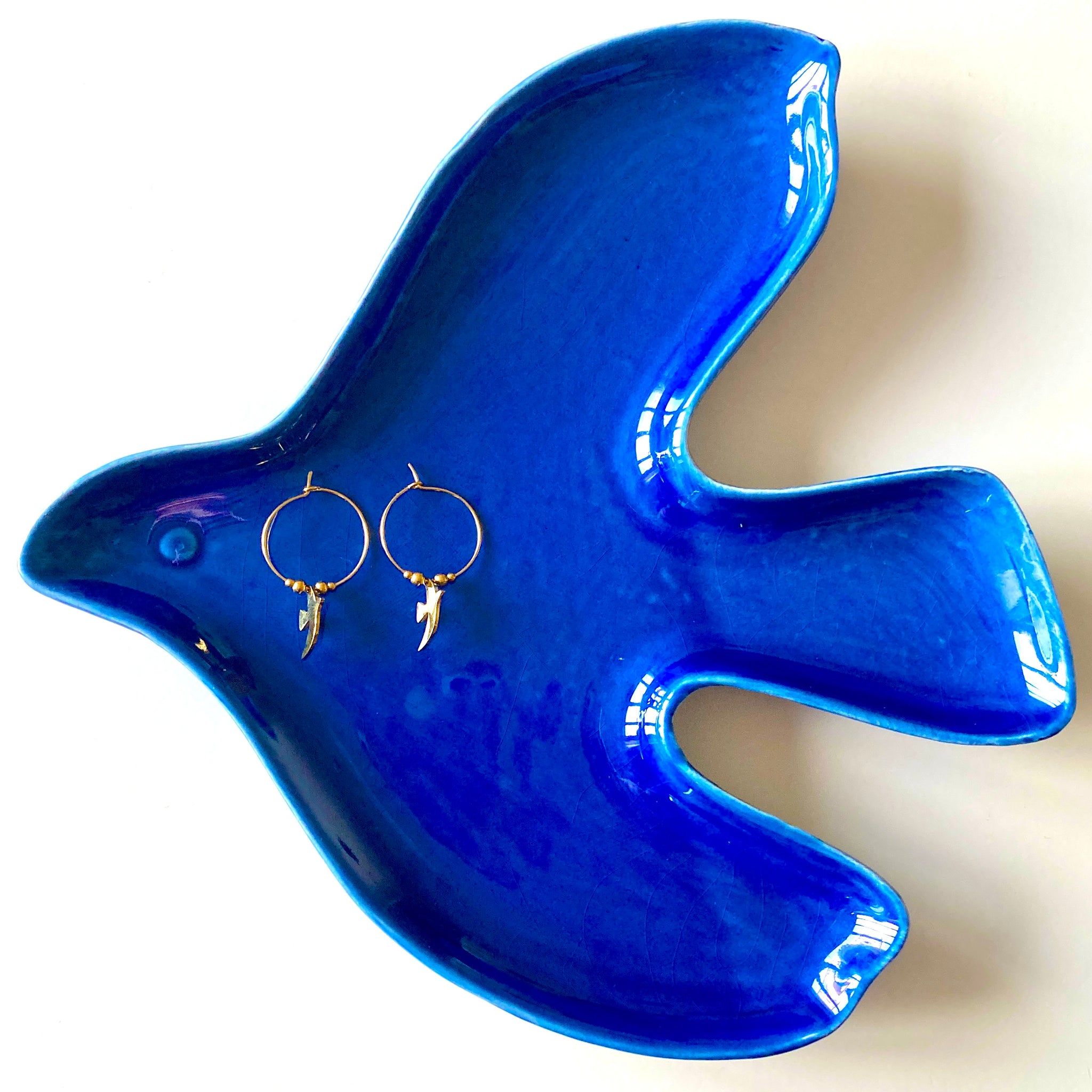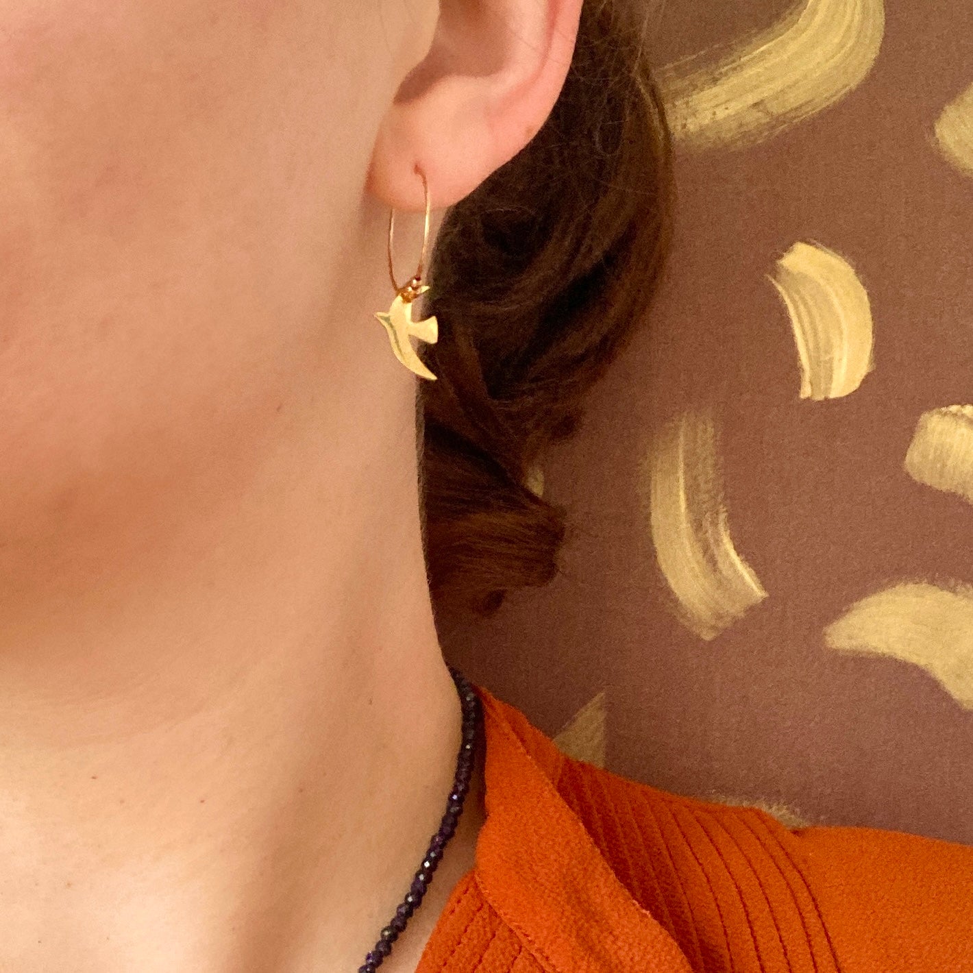 Boucles d'oreilles créoles hirondelles et perles en acier inoxydable doré.
