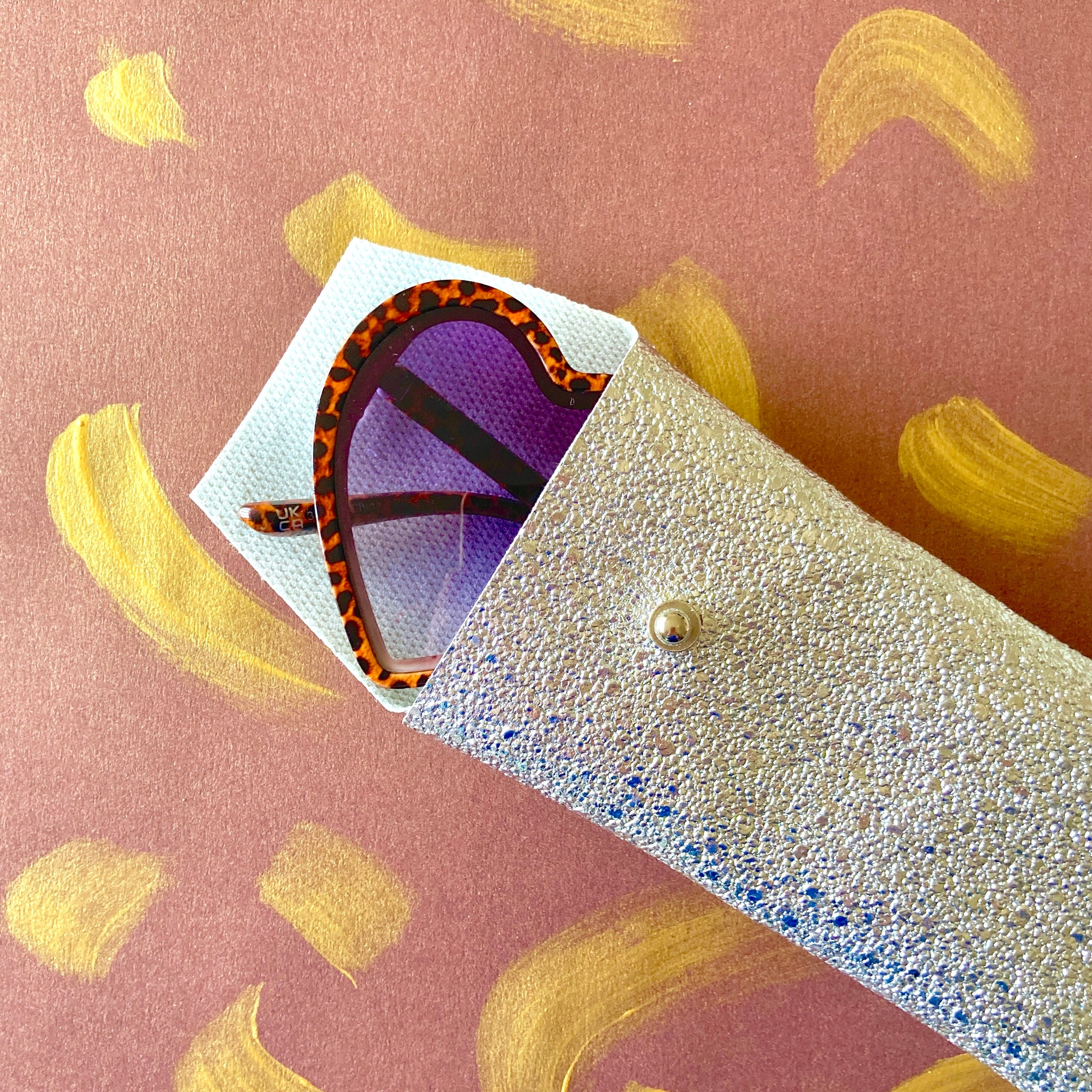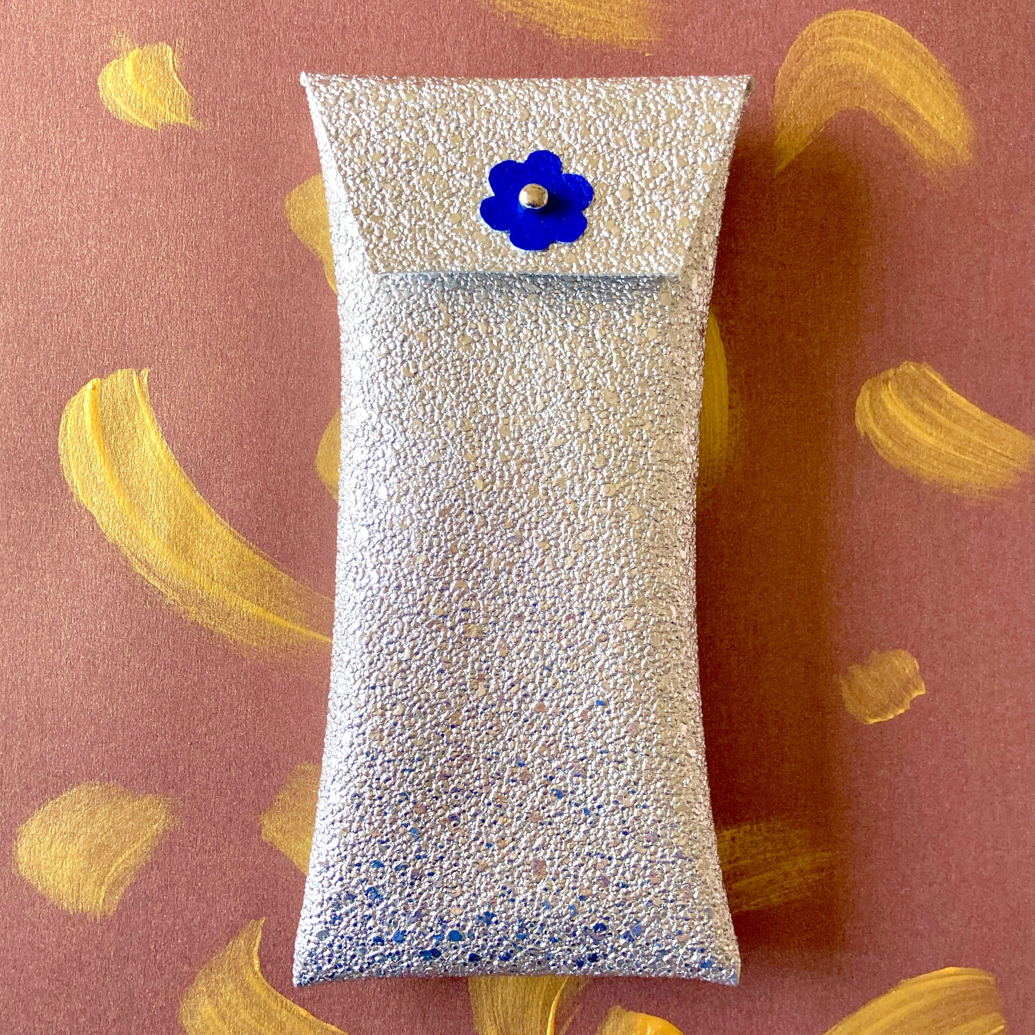Étuis à lunettes en similicuir argenté et fleur bleu roi. Fermoir bouton de col argenté.